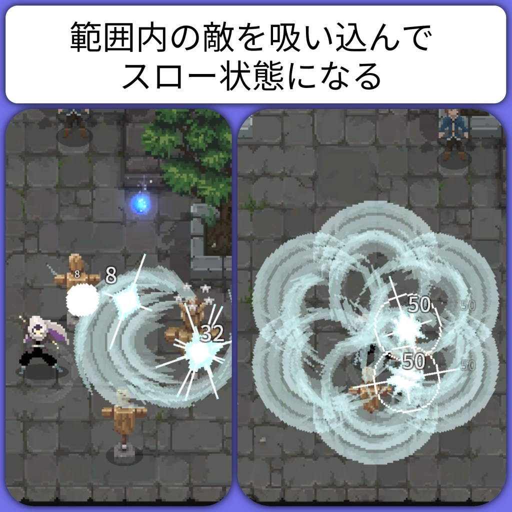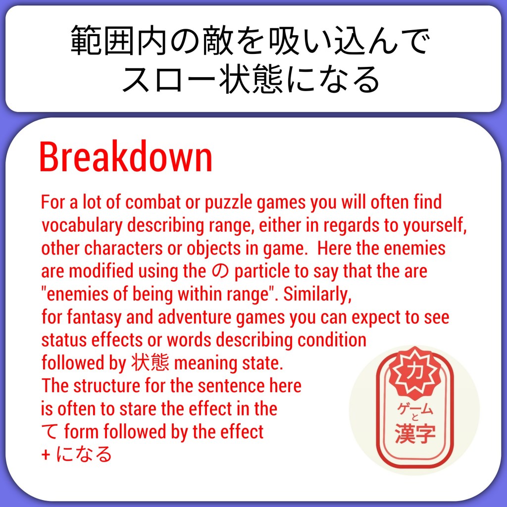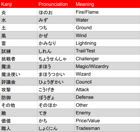 Wizards has a clear and legible user interface with attractive font and no blocks of text that are heavy or intimidating. The variety of language is vast with many unmoving dialogue boxes, item descriptions and menus. All of the text presented in the game is at most 3-4 lines long so it makes understanding each phrase digestible and easily approachable. The style of the language also varies from short and instructive, through to casual conversational and on to poetic and descriptive. The range of vocabulary is, for the most part, focused on elements, magic and trials but due to the way that spells in particular are described you can gain an understanding of direction, force and shape of certain attacks. Adjectives and modifiers such as 前方, 広く and 連続に meaning ahead of you, widely and in succession respectively are often not found in textbooks or day to day conversation but are abundant here.