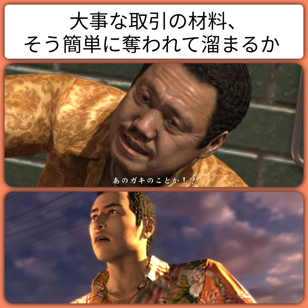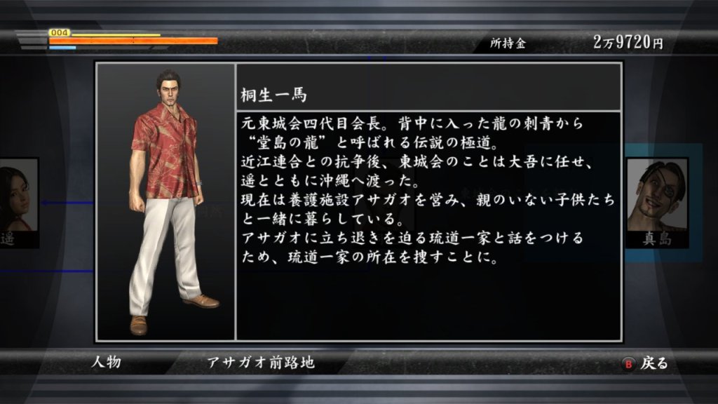 There are many aspects of Yakuza 3 that are usable for studying. To start with, the games cutscenes are voice acted in japanese with large and clear subtitles. Outside of major cutscenes the dialogue continues in paused textboxes meaning you have a nice balance of continuous voiced dialogue and standard text. Yakuza 3 is incredibly text heavy in terms of the interface. The pause menu has a wide selection of tabs to delve through, each one with its own vocabulary and layout. After the first chapter you also gain access to the Okinawa hub. From here you can review character files and the family tree as well as prepare your inventory and review your game progress.