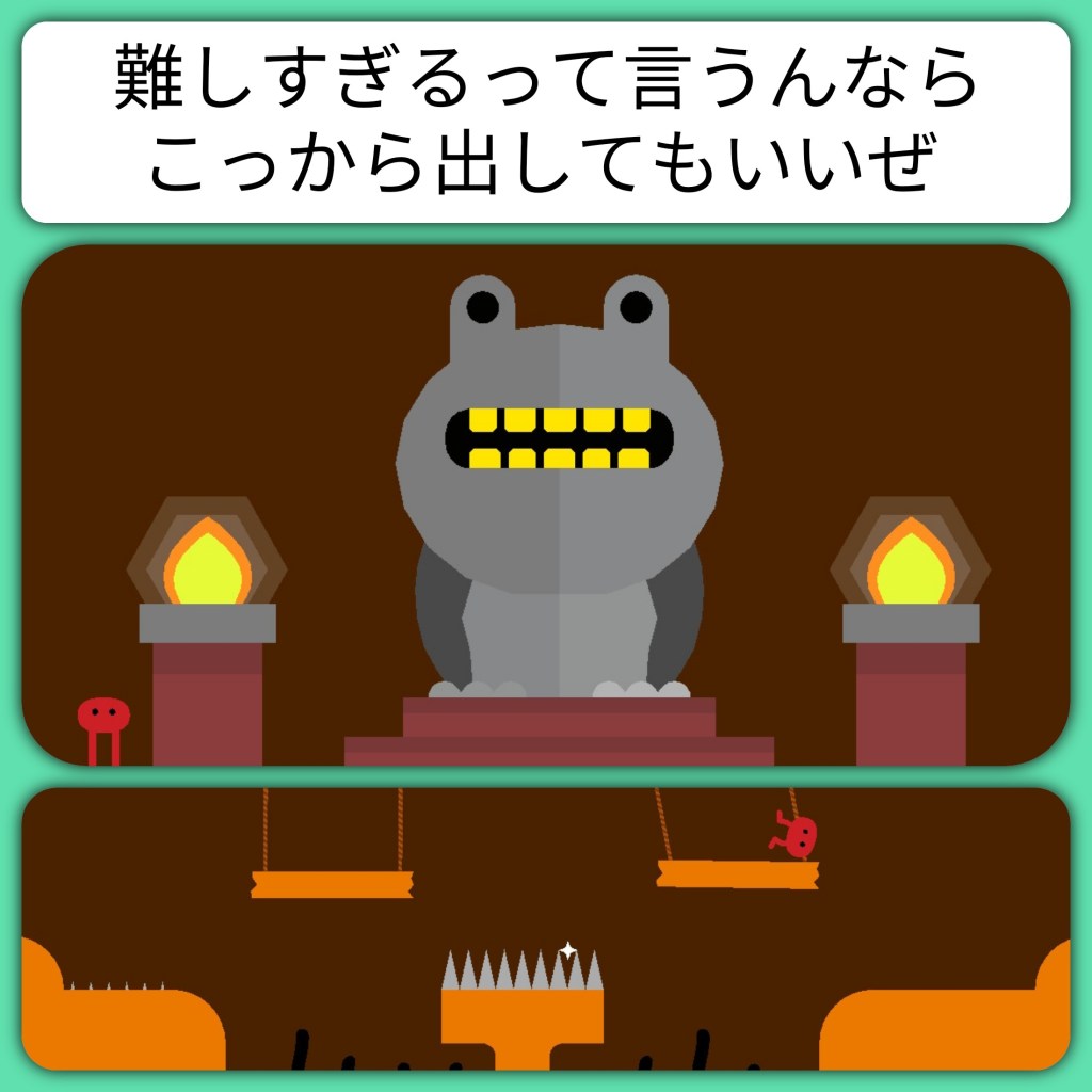 If you were to play through the multiplayer mode you can find a fairly standard volume of readable text for this style of indie platformer. Menus have clear writing and new obstacles come with instructions that are easy to read and use concise grammar. The Ace up the sleeve (of which most players would have seen first, I’m aware I goofed on this one) is the single player adventure. From the very start I knew what I expected and what I was about to experience were vastly different.