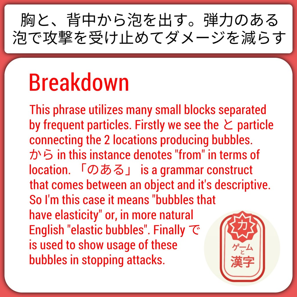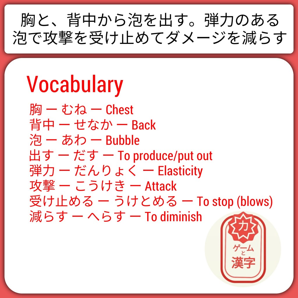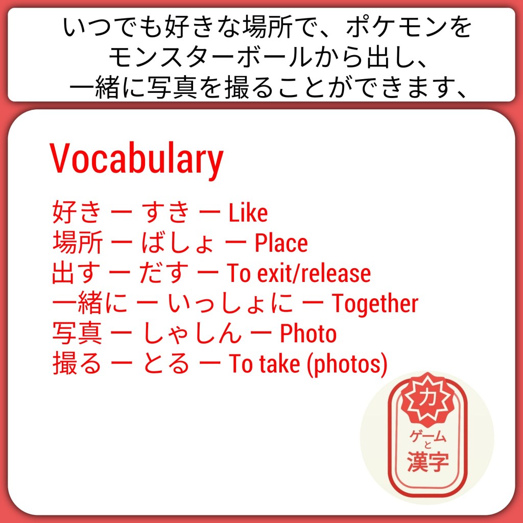 By far the most prevalent and advanced aspect when it comes to learning new words and phrases is the Pokédex entries. Each and every Pokémon will come 2 to 3 lines describing their elements, environments, folklore and all manner of anecdotes about what they do for their trainers. This means that descriptions starting from water can lead to vocabulary for bubbles, waterfalls, whirlpools and more. Grass Pokémon are compared to the plants that inspired them and how they interact to the weather. Each and every region and type has a short story that can be logically followed (especially if you already have an understanding of Pokémon) meaning you can enjoy building your understanding piece by piece and in certain cases find reused words for similar Pokémon in order to strengthen and revise your vocab.