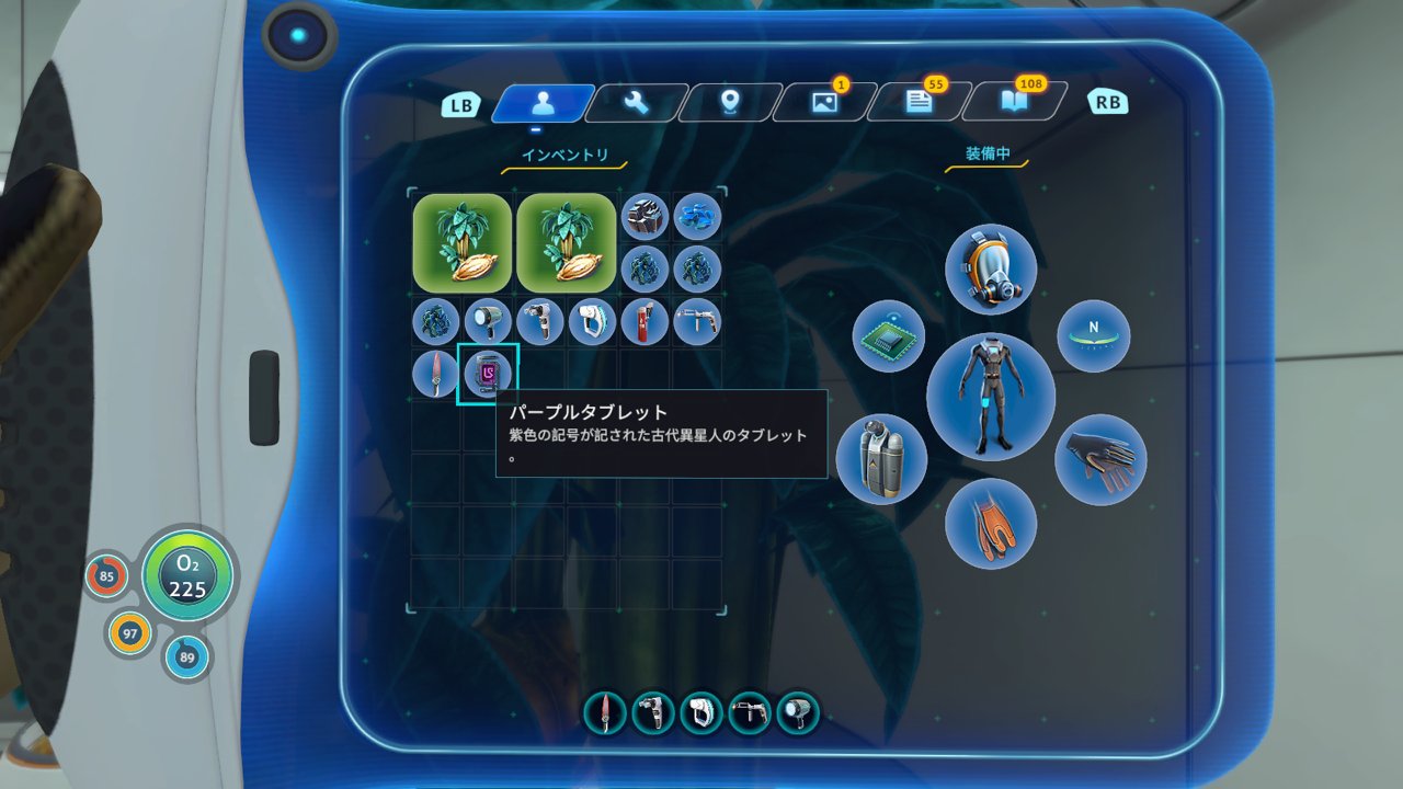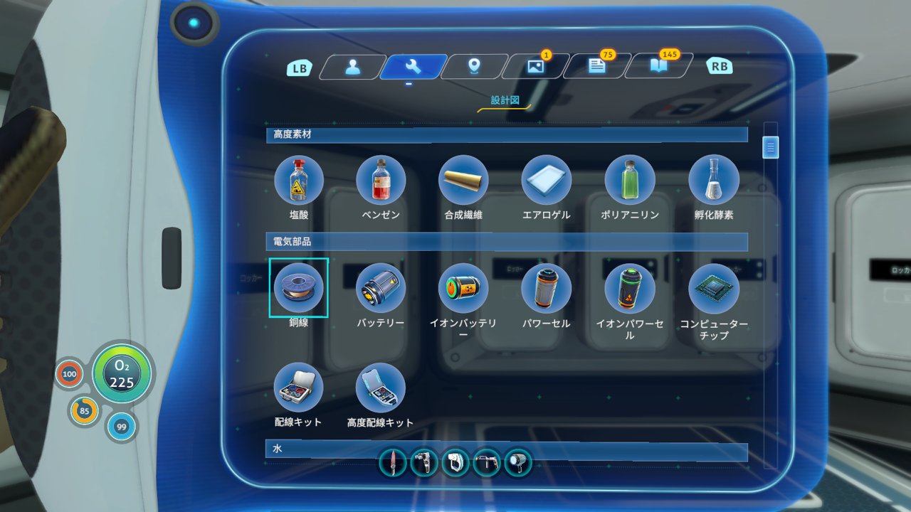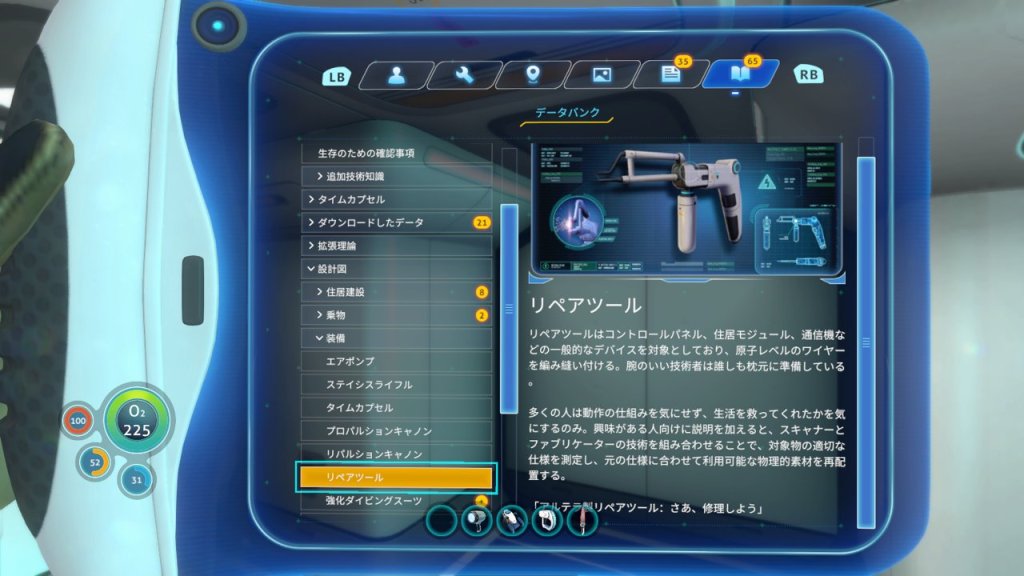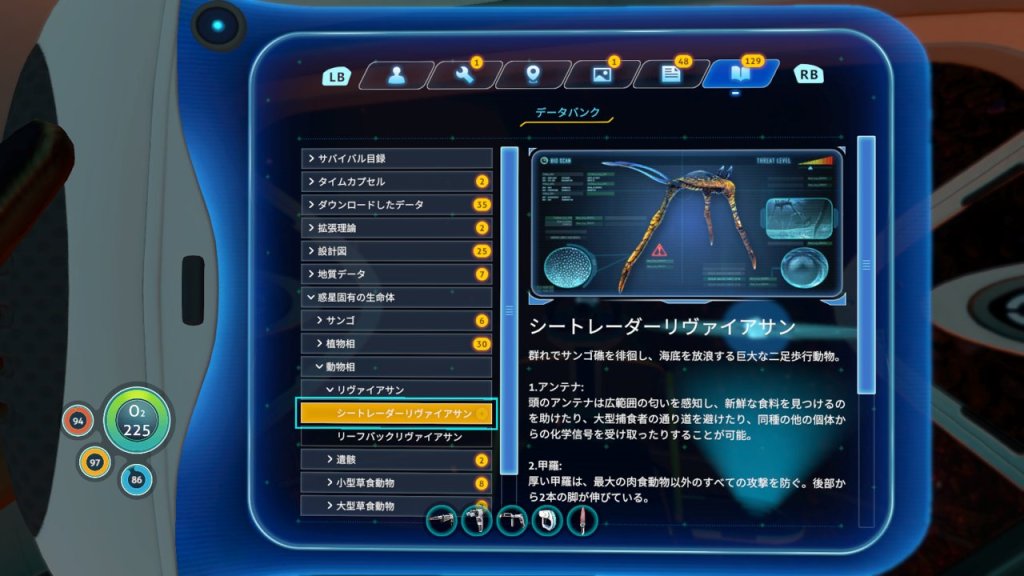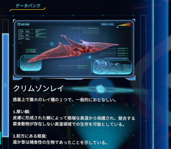 Subnautica has a brilliant way of making you embody the role of a biological scientist. At every stage you are encouraged to pull out and use your scanner tool. This is a cool little gadget that allows you to produce a data log to add to your extensive database. These files often includes an image coupled with various facts about the properties of the item, organisms or equipment you are scanning. For animals and plant life this can include a clue into their lifecycle or position in the foodchain whereas for equipment and vehicles you can read more in regards to the early development or available functions. The variety of reading material even within one subsection here is immense. If you did want to expand on other topics you also have environments, alien discoveries and even a basic survival guide. The survival guide in particular is a fun little written introduction into some basic requirements that are applicable directly to the how you are playing making for some relatable and digestible vocabulary. For additional support and similarly instructive language you can also couple your gameplay with a number of strategy guides in Japanese such as these: グリム通信 and Seesaa Wiki