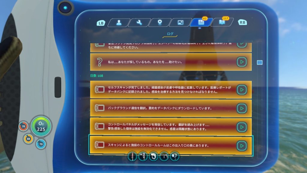 As discussed, while reading through the various logs you’ll notice that your hunger, thirst and (if in open water) oxygen levels decrease. If you’re feeling brave and fancy a challenge see if you can read or write out a whole data log before one of your needs runs out. If this proves too easy then try multiple logs or some of the more expansive texts. After giving this a go a couple of times you’ll be grateful for the shared vocabulary between certain items and subsections. I would recommend ensuring you have ready supplies before trying this one!