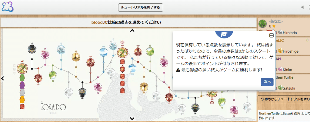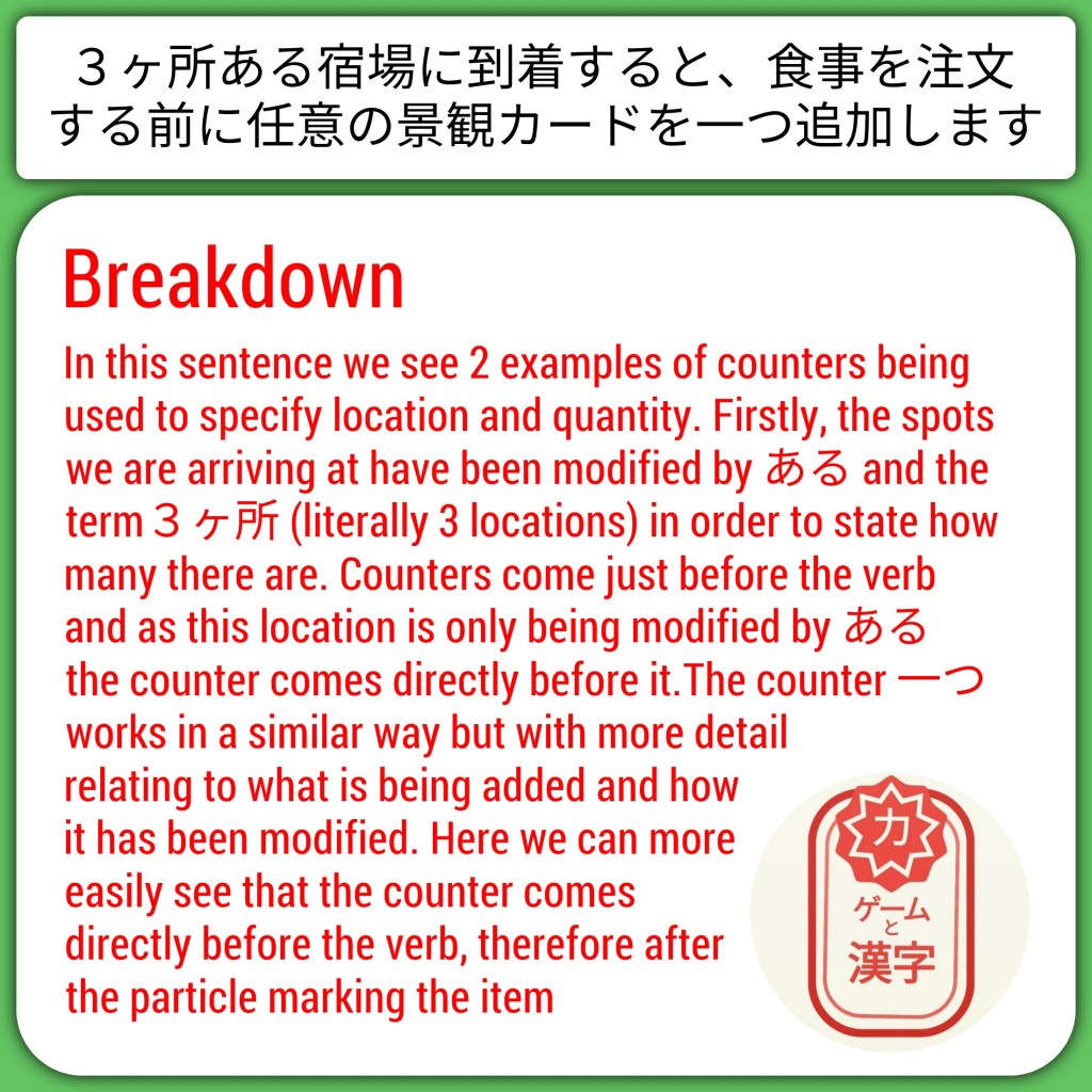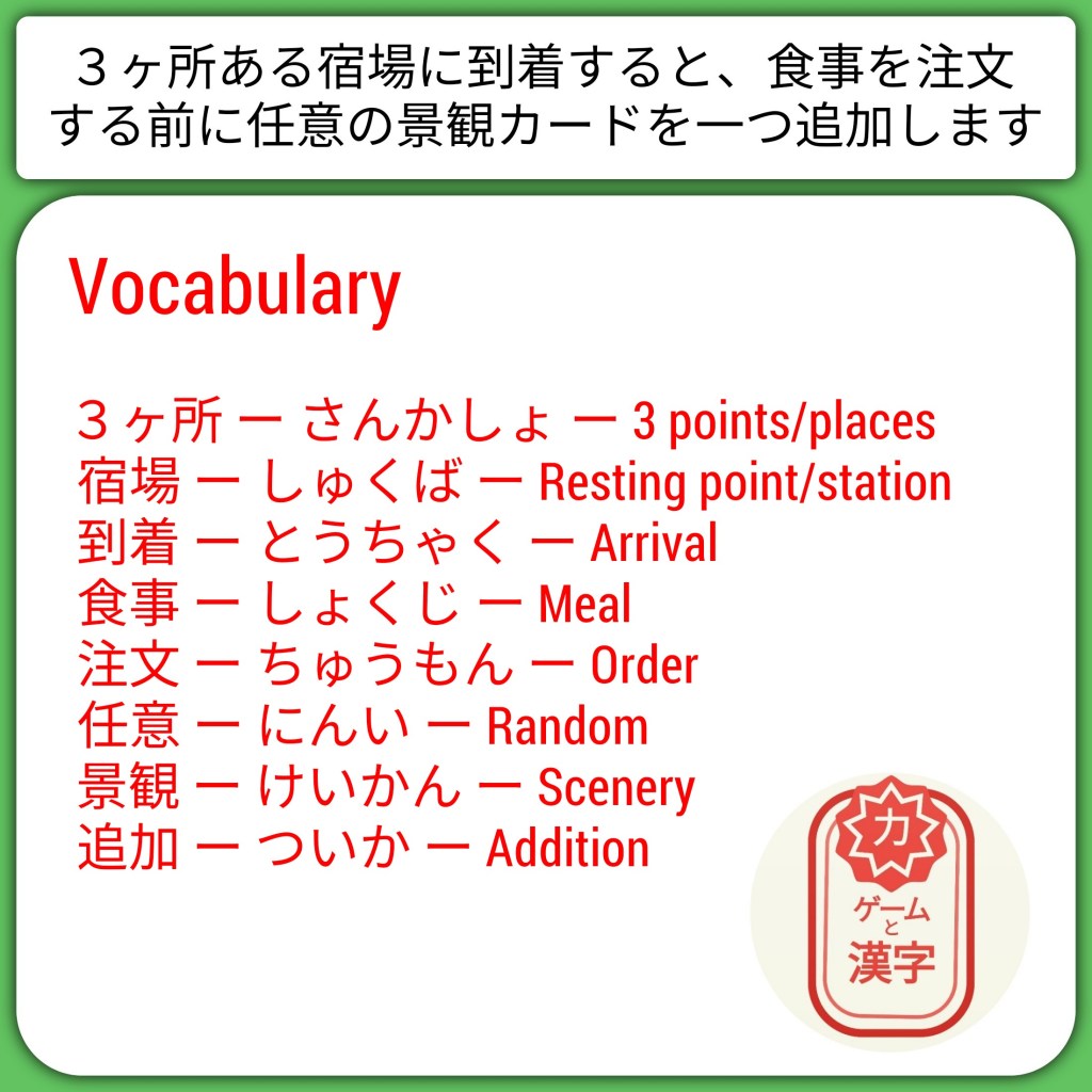 While playing Tokaido I could formulate a challenge from a number of things, take the character selection screen and their respective skills, however a few factors make this less and less viable. For instance, each character skill, although distinct, shares a lot of relevant vocabulary meaning there isn’t so much challenge any more even after memorizing or writing only the 3rd character. Other points in the game are also either to random or too brief to be able to set yourself a hard goal. As such it falls to the only aspect discussed here that has a reasonable volume; the tutorial. I fully believe it would be a benefit to many beginners of Japanese to write through the steps and maybe speak aloud at the same time in order to build their confidence with statistical language and instructions before playing through a few rounds and seeing what vocabulary you can maintain.