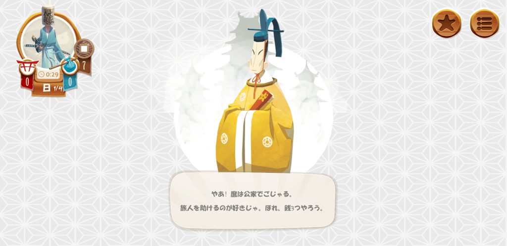 If it weren’t for the browser version of this game being readily available I would have likely reviewed this game more poorly than I intend to now. That’s not to say that Tokaido is a bad game for picking up vocabulary, just that the language itself and the volume of it is scarce. On your journey from Kyoto to Edo (Modern day Tokyo) you will come across only 4 different types of spot on the map that include language in any form; the souvenir store, the temple, the random encounter and the inns. The rest of the points, although beneficial in your tactics to win provide no additional dialogue. The text that you find in the wordier areas of the game are brief, often repeated and hold little relevance to conversations you would hold in modern day to day interactions. Unfortunately it’s not often you will be speaking about making donations to the local temple although you could also argue it is better to have this knowledge and not need it than the other way around.