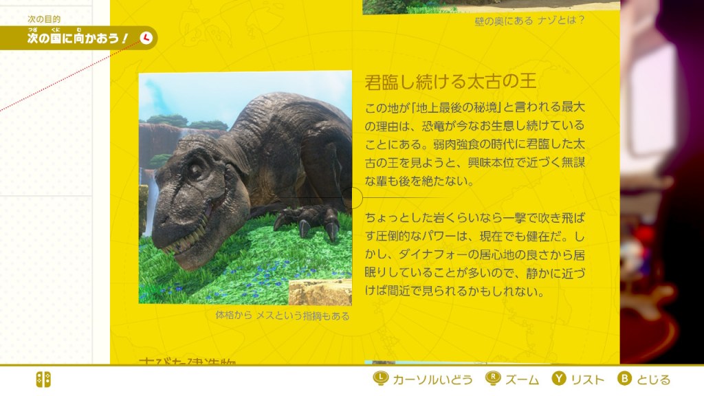 For me, the jewel in the crown was the Odyssey map. For each kingdom you have an instantly accessible map that shows your location, checkpoints and objectives. This gives vibes of tourism and exploration making for more excitement and investment into each of the story set pieces as you come across them. It also incentivises your ability to understand the text and you are often rewarded with hidden clues and secret moons. The text here is akin to a game guide (a personal favourite reference for me) but also allows you to read text in the style of historical, cultural and natural non-fiction even within this living, breathing fictional world. One notable difference with this text is that the furigana is more sparce and on a lot of cases absent entirely meaning you’ll need to step up your reading “A” game to follow it.