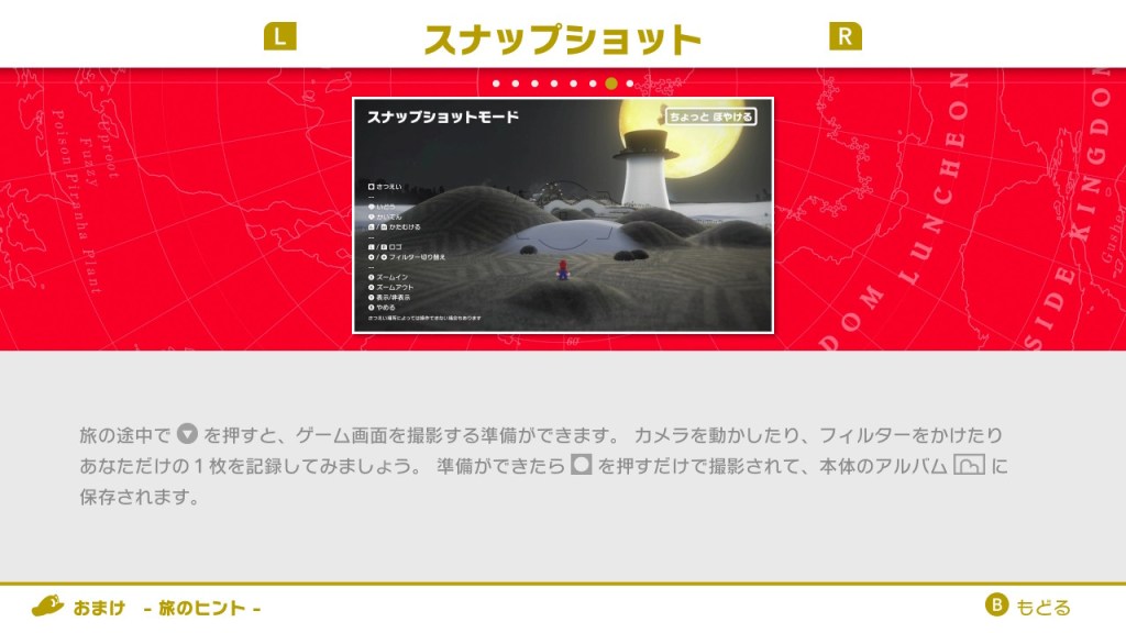 As if all of the above wasn’t enough, Odyssey also comes with a trend I’m seeing more and more in modern Nintendo titles, an in depth tutorial breakdown. This can easily be accessed at any point from the + menu and features a variety of tutorial styles including a controller map and basic actions. Some aspects of this, similarly to the capture list above, use simple verbs and singular nouns while the menu marked “Travel hints” shows a more guiding and instructive writing style. While I feel like this won’t be the most interesting aspect of Odyssey to read it is a hub for commonly used “gaming” words that can be utilized in any other titles you play.
