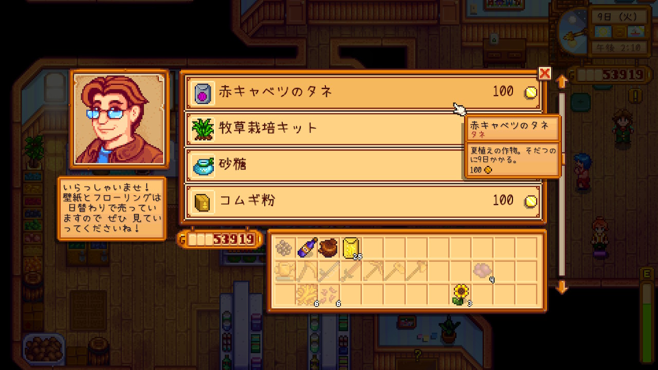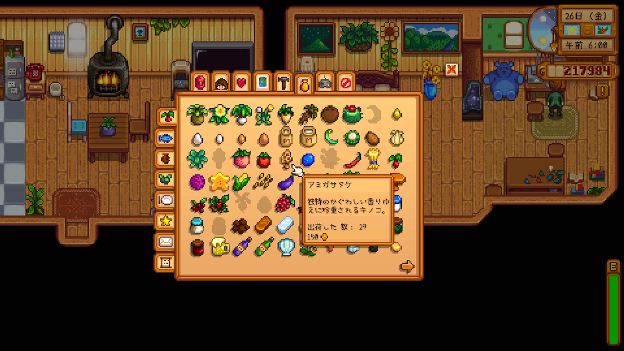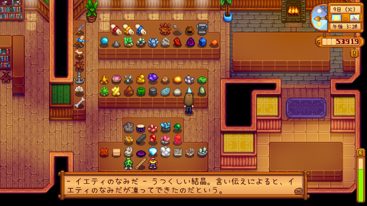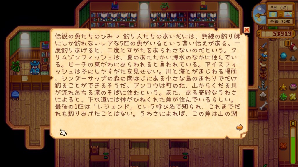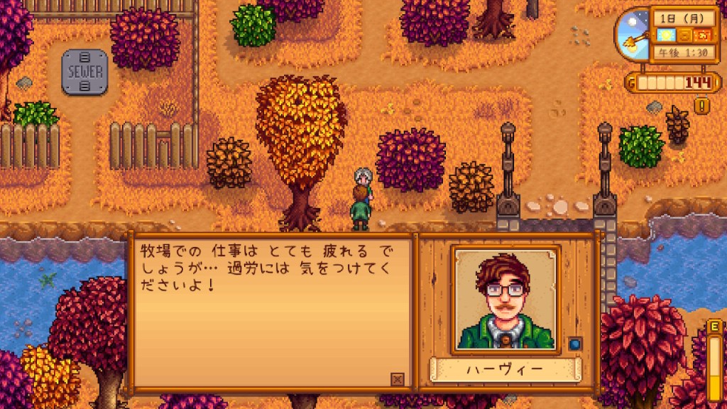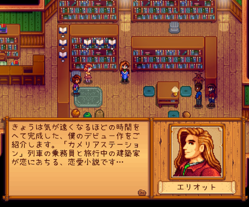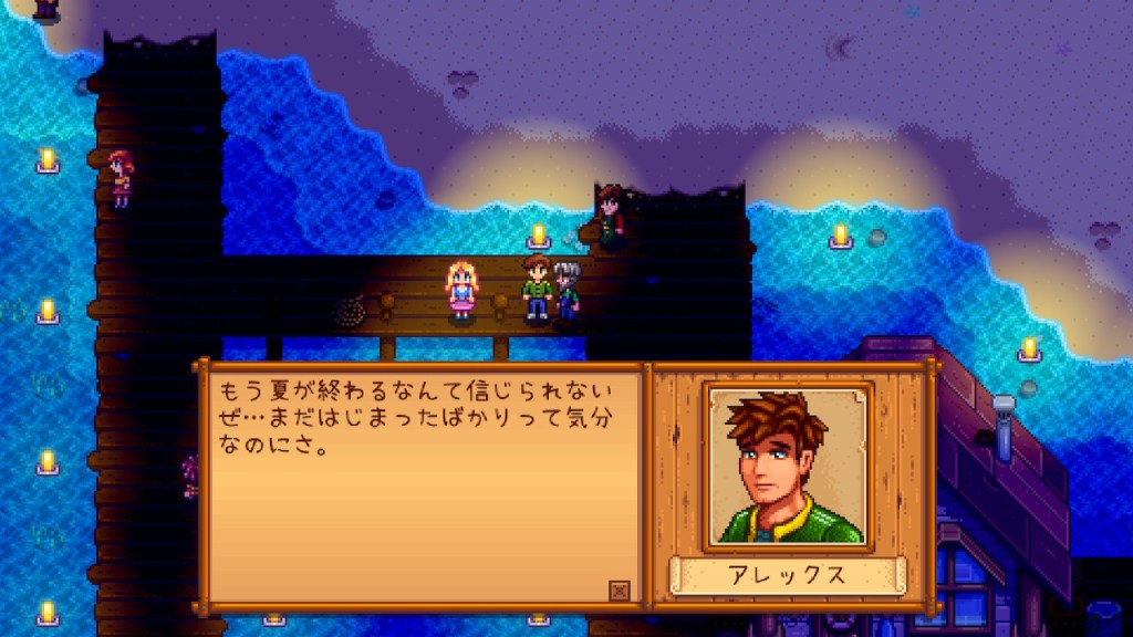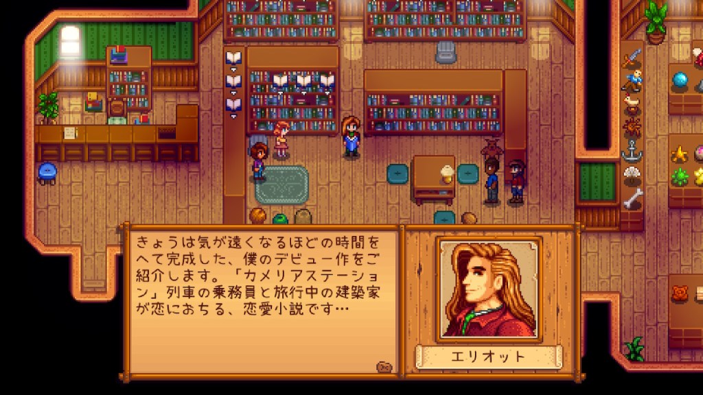 The characters in Stardew are likeable (for the most part) and feature heavily all throughout the narrative of the game. Each one also has their own personality trait that can either tie in with the above mentioned products or can unlock a new wave of vocabulary. One such fine example is befriending Elliot. He’s a linguist and speaks more eloquently than most of the other townsfolk and as such his quest line and phrases carry different ways of speaking. On a daily basis you can speak with each townsperson twice to see a brief greeting or musings from them and you can also give them gifts which, depending on your research into they’re likes, can illicit a more emotive message of delight or disgust. If you’re interested in supplementary reading check out the Stardew wiki in Japanese here or head directly to the residents page here for gift specific tips.
