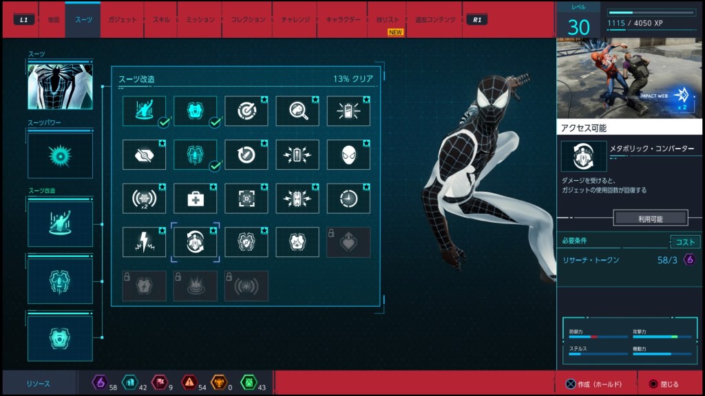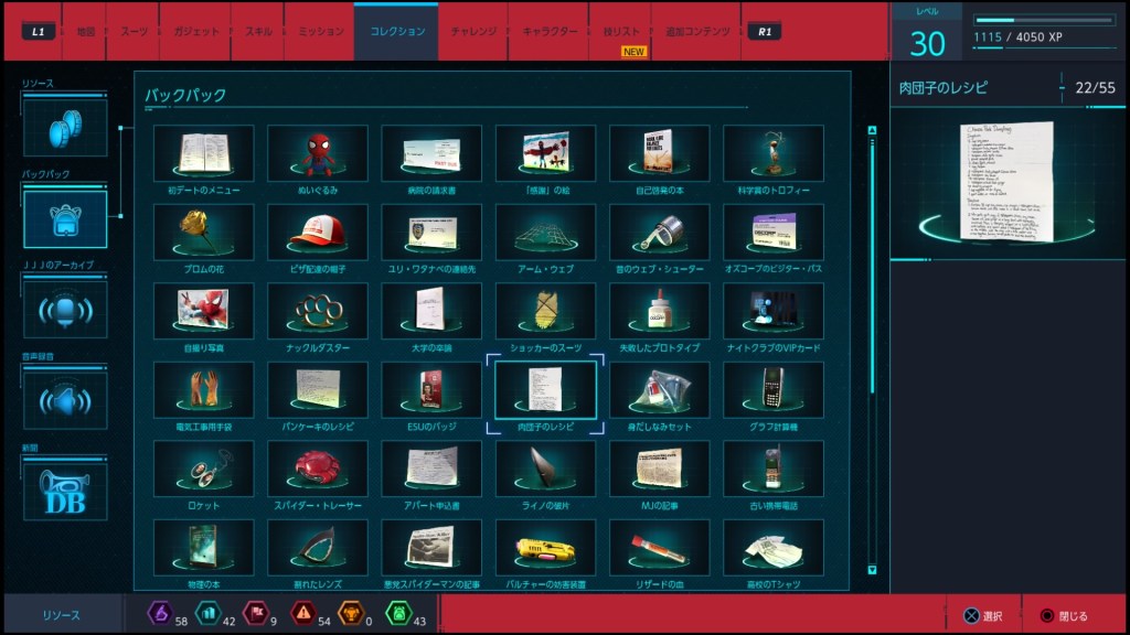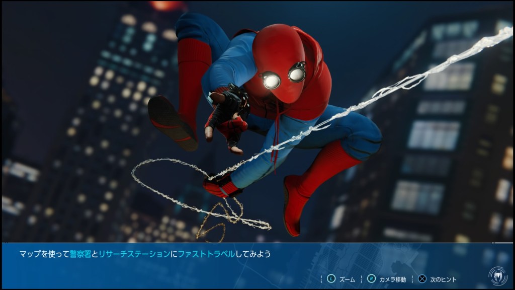 The next most fascinating part of Spiderman for me was the menus. User interfaces are a necessity in all video games but there are plenty of instances where your pause menu can just be a few options and sound settings and nothing more. This menu is phenomenal. Every aspect of your kit, abilities and research while playing as Spidey is laid out in tremendous detail. Your selections for your gadgets, special abilities and suits goes on and on and each one has a it’s stats, a description of its abilities and peripheral detail on how to unlock it. Needless to say you can spend hours scrolling through this menu and the content is incredibly nostalgic and engaging. Unlocking a new suit in particular gives a whole new buzz to how you approach each scenario (and makes for some nice new photos in the photo mode!).