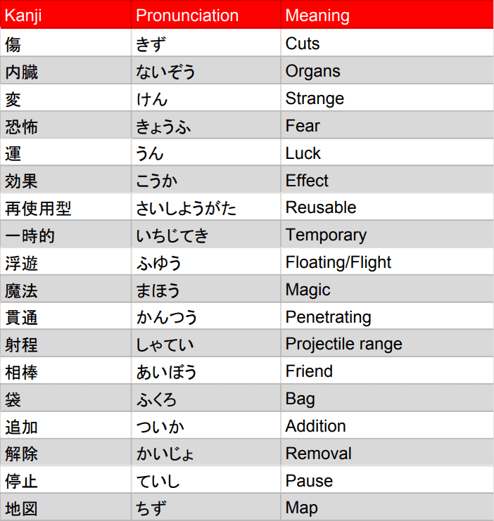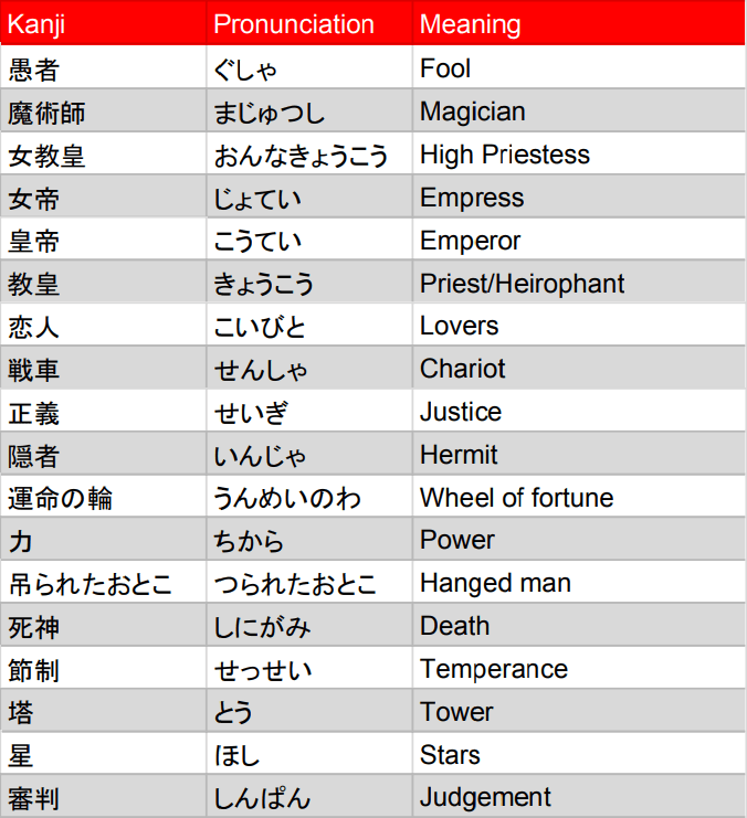 There are many groups of items found in The Binding of Isaac that can make memorisation easier. You can take the time to memorise the names of challenges (Even working out the kanji that could have been used), stat names and even smaller items like the pills and tarot cards. The tarot cards are a good example of words that while seen in a run may be difficult to look up but if you look them up ahead of time you can test yourself on the fly.