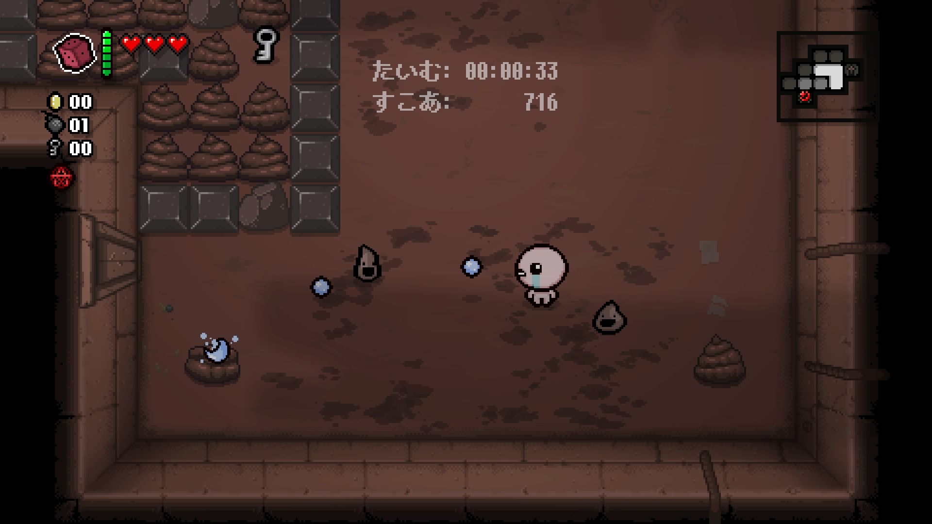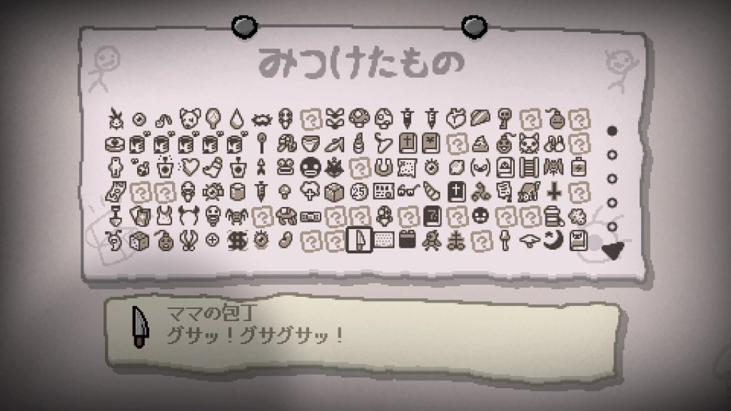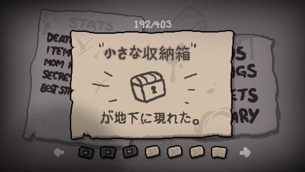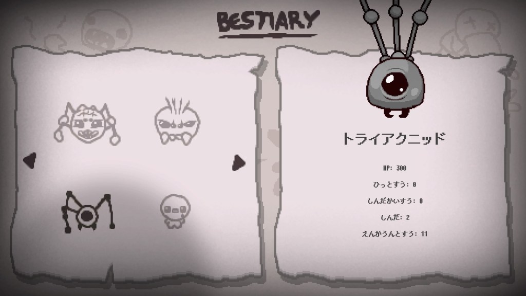 Isaac’s biggest benefits come from it’s stats page. Here you will find the bestiary, secrets and item pages. The bestiary features pages of each of the discovered creatures with a few brief descriptives of how many you’ve killed and encountered and the creatures name. The vast majority of creature names will be written in katakana (A happy separation from the menu mentioned above) which is great practice for beginners looking to strengthen their reading of names and loan words. The secrets page is split between early items, written in English and the later DLC items which luckily have been updated accordingly. Here you can find some item descriptions, events and a sprinkling of verbs.
