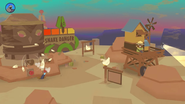 Next is the chicken sat on the swing. If you push the swing for 1 rotation it will break the swing. Lastly, if you approach the button it will set of a klaxon, scaring the chicken on the rocks and causing it to fall. This causes the buildings and mechanism to spontaneously break. With that, get everything into the hole.