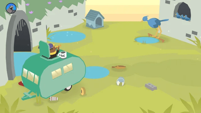 次にブランコに座る鶏は、ブランコを押して1回転させると、ブランコが壊れる。最後に、岩場に座る鶏はボタンに近づくとクラクションにびっくりして降りていくる。すると周りの建物、機会が一気に壊れる。これを全部穴に入れていく。