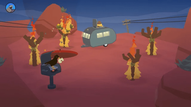 このエリアは焚き火がポイント。焚き火が穴に入るまで穴を広げていく。焚き火を穴に入れたら、穴の中が燃え始める。カラスが落とした炭火を穴に入れると、炎が立ち上がる。