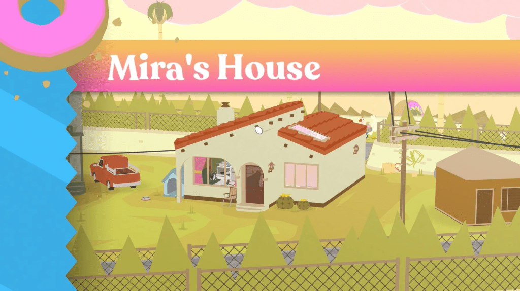 ゲームはミラの家から始まる。ミラはBKとメッセージでやりとりしている。メッセージのやりとりが終わったのち、カーテンを開け、窓を開けて外に出る。穴に文字や物、動物まで全部穴に入れていく。