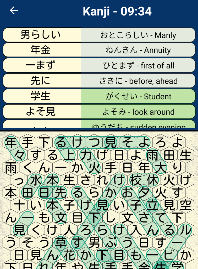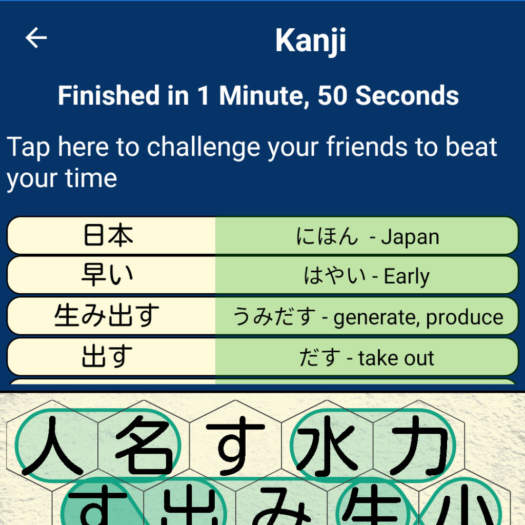 This app can easily be used in replacement for a vocab lists but essentially follows the same premise. You view words, attempt to commit them to memory and then move on. This way however you are forced to focus on one particular word, possibly even saying it in your head as a constant reminder, until you’ve finally found it. You’ll even get an SRS-esque effect (try saying that 5 times while you’re pissed) from repeatedly completing and starting new wordsearches. As if that wasn’t enough, just like with regular wordsearches, you’ll find words crossing over frequently. For a language like Japanese where kanji are attributed meanings rather than pronunciations this gives an abundance of words using the same kanji and shows you their readings at the same time, further strengthening your readings and familiarity.