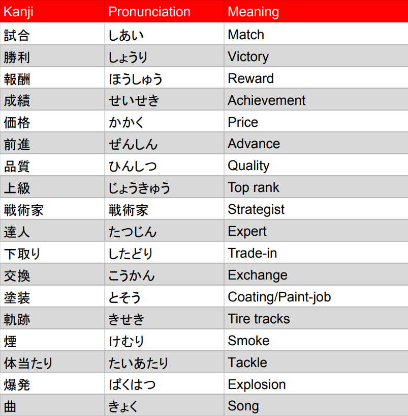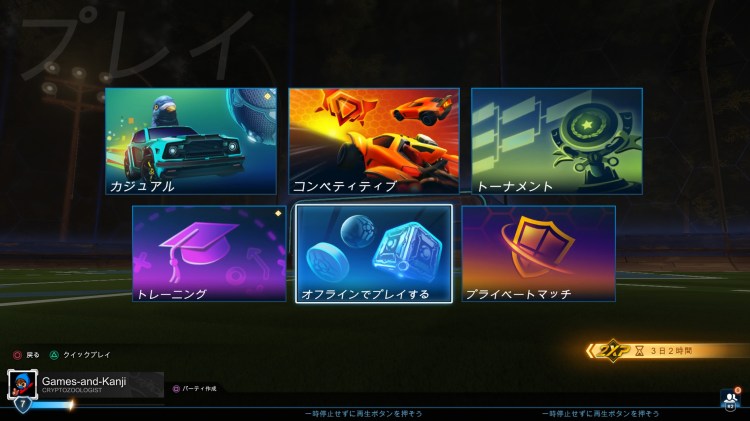There is an abundance of menus throughout Rocket League however the ones most subject to change and that cover the larges volume of text are the ones relating to either online play or online stores. Again, much the same as the above, many limited items in the online store feature desscriptives that can aid your understanding of the physics and mechanics of the gameplay. The competitive and seasonal notifications take this to a whole new level, utilizing terminology around success, progress and match play, often in paragraphs rather than sentences. With the frequency that seasons and new gear come out you’ll rarely run out of useful things to read. Also, don’t let the larger blocks of text scare you too much. Rocket League is very katakana heavy so it may be possible for you to read larger blocks of text more simply than you’d expect.