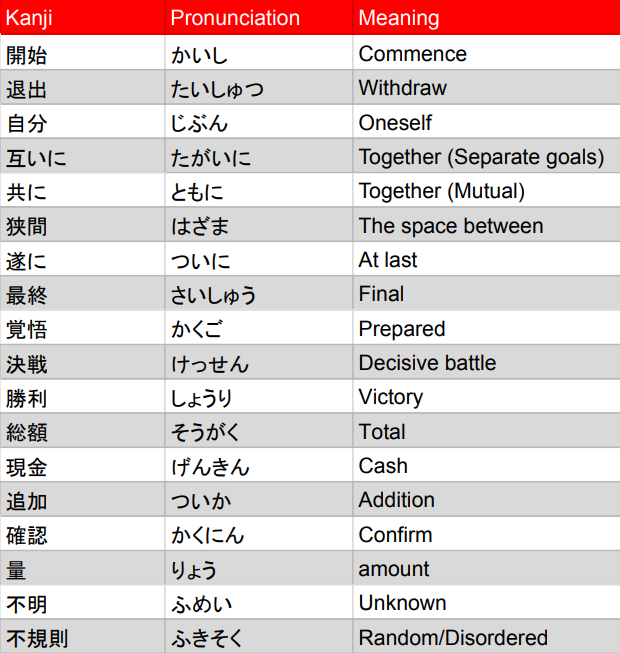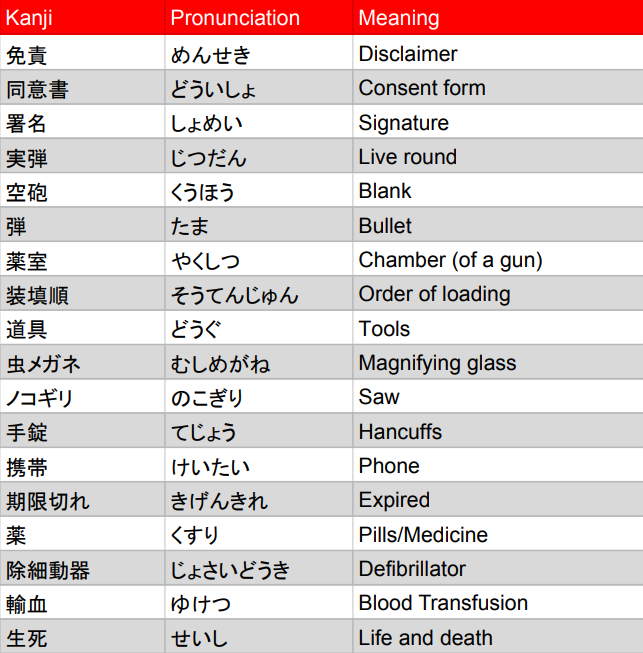 While russian roulette is a game of chance for the most part, Buckshot Roulette throws a few new features into the mix to make this slightly more interesting and much more up to skill than chance (not 100% but comparatively so). The addition of new items and feature also opens up the requirement for new rules, ergo some homework to do in order to know what everything does. I’ll start off by saying the Buckshot is not a very extensive game when it comes to language, in fact, the glossary about includes almost every single kanji word you can find in the single player mode, hence the 4 pages for such a small game!