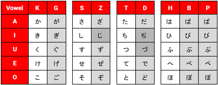 Again, there are some slight exceptions that I’ve highlighted in the darker grey. These are akin to the first 3 exceptions from the above list under “A few exceptions”. While the じ kana is quite common the other two are seen less frequently but are prevalent in compound words and kanji so don’t forget to make a mental note.