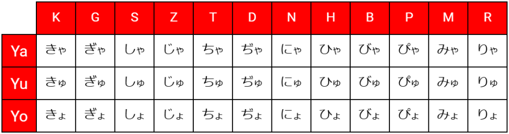 The next way to modify kana is actually to combine them together, making what’s known as “You-on” or “twisted sounds”. Luckily not all kana can be combined, only い sound kana (Such as き, し and み etc.) can be modified in this way.