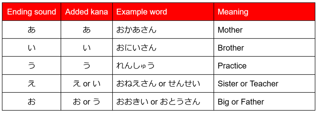 For instance, taking the か and extending it by adding あ in the word おかあさん, meaning mother. This extension of the ending sound of the previous kana can be done for all of the ending vowels. For instance, あ can be added after any other sounds that end in an あ, い can be added to any other sounds ending in an い and so on.