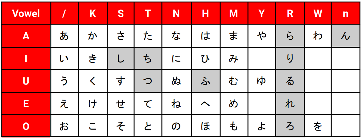 Referring back to the hiragana chart we saw above, the grey highlighted squares are exceptions to the readings. The highlighted kana below do not follow the rule of one consonant and one vowel or do not match the expected pronunciation.