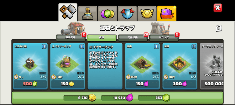 As your village starts to grow you’ll sequentially be introduced to a number of menus. Many of these can be found under the “Store” button on the bottom right side of the screen but many select buildings also have their own menu containing purchasable units or upgrades, such as the barracks and laboratory. One example a particularly large menu is the buildings menu, where by tapping on the little “i” icon of each selection you can flip the card and read about their functionality. These descriptions are brief but encompasse a combination of interesting lore based descriptions of how the tool, trap or weapon works, followed by a more literal, game logic description of the stats or resource it effects. You can also access these descriptions by tapping on each individual building around your camp and hitting the 3 bars below the stats.