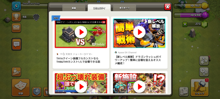 Next up is something that surprised me, at least for the moment I hadn’t seen anything of the sort, but Clash of Clans includes a community tab that contains regularly refreshed links to video content about the game. This tab within the news and notification menu provides a variety of YouTube videos and links to show you interesting tactics and base plans, popular content creators and their latest invasion successes and more. The variety spans from beginner level descriptive content, explaining where you should be placing your walls and town hall, all the way up to entertaining, competitive level sieges.
